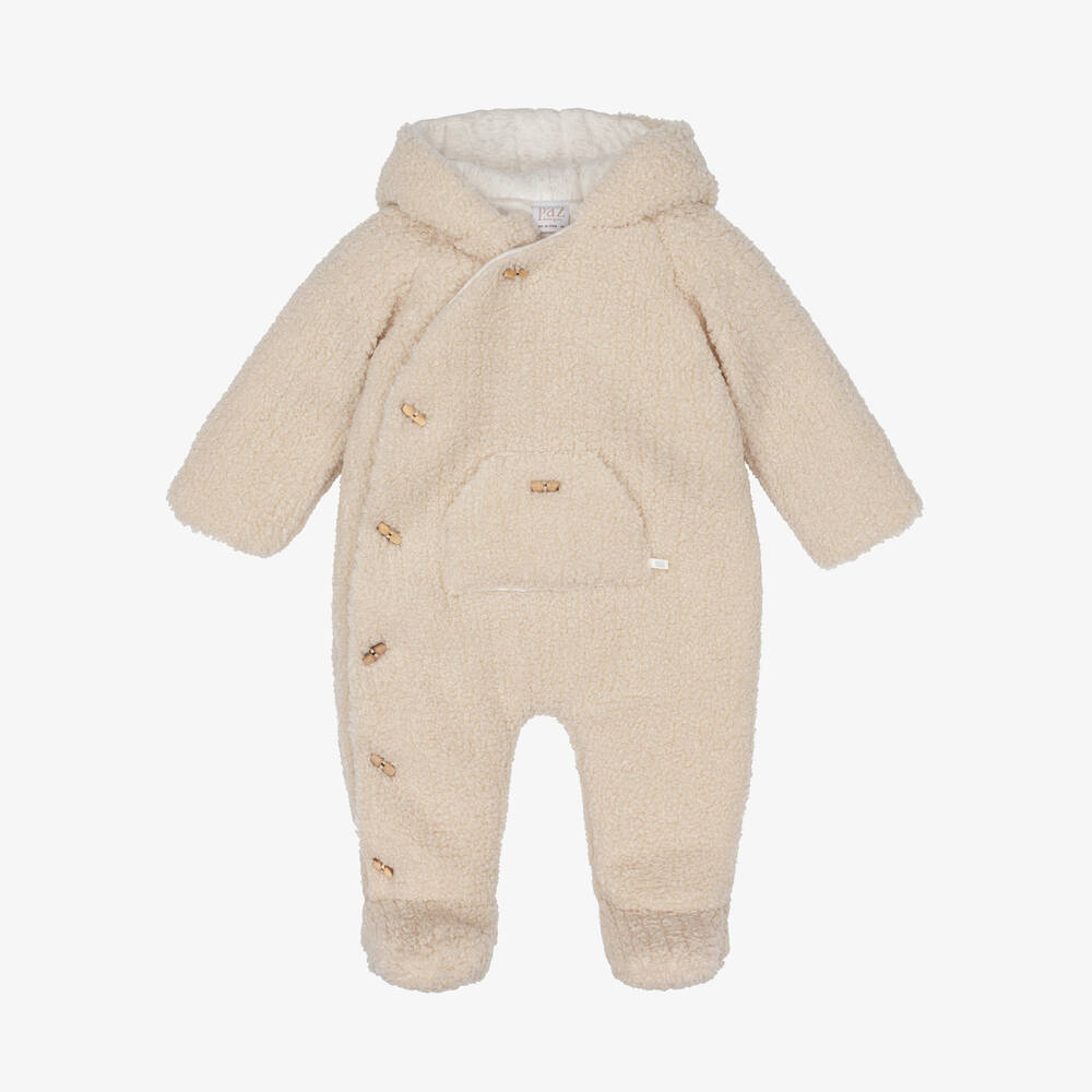 Warm and snuggly beige pramsuit for baby boys and girls by Paz Rodriguez, made in super soft sherpa fleece. With a fixed hood and enclosed feet, this cute pramsuit is ideal for those colder days. It is fully lined in soft jersey and fastens down one side with wooden toggle buttons. For a sweet finish, there is a little pouch pocket on the front, trimmed with the Spanish brand's logo tab.
