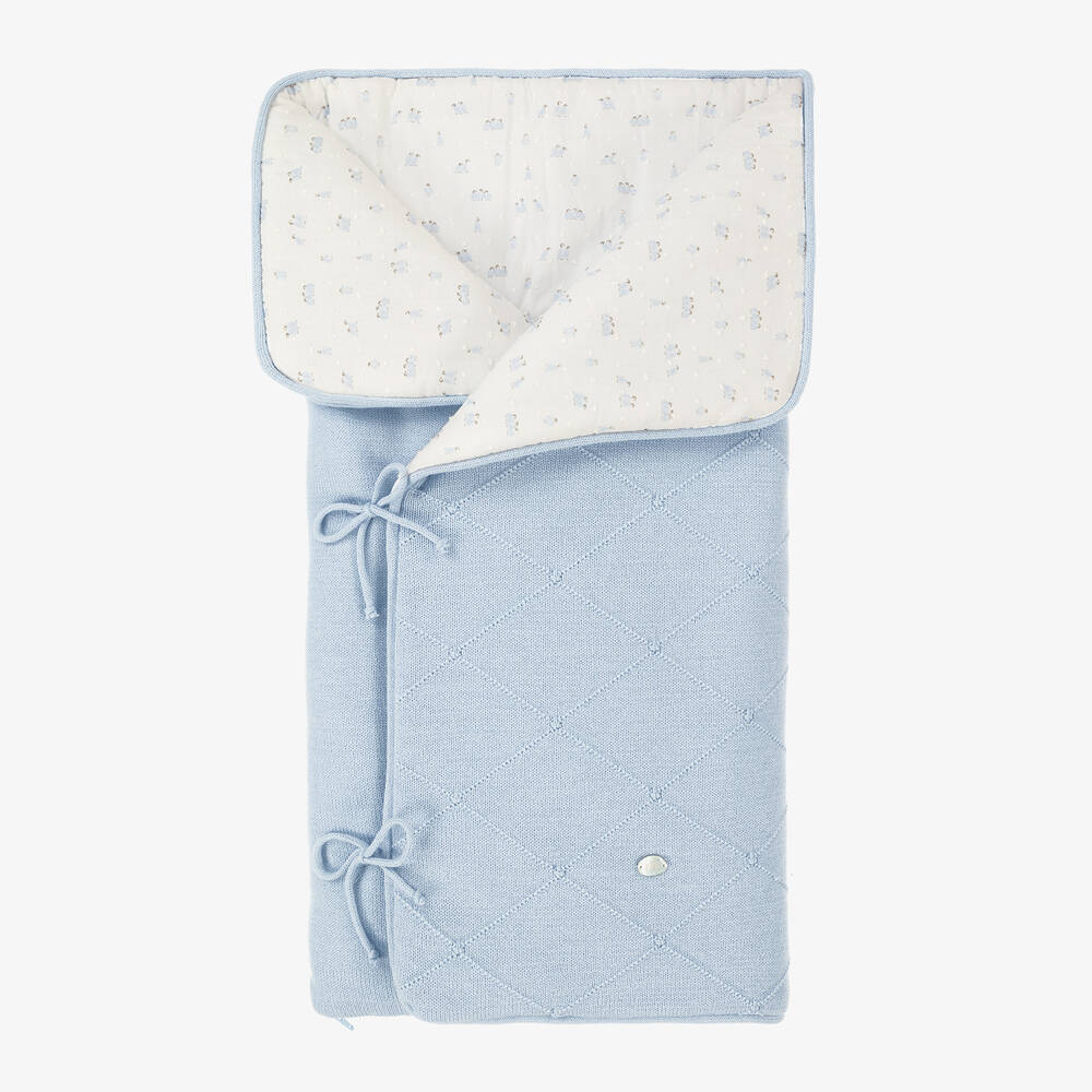 A pale blue, softly knitted baby nest for boys and girls by Spanish brand Paz Rodriquez. Softly padded for cosy comfort, it has a white plumeti cotton lining, patterned in a sweet penguin print. Designed in a cross-over style, the nest has a diamond-patterned front flap, securing with ties at the side, and with a zip fastening underneath. There are useful openings on the back for use in the car seat or stroller. Adding a finishing designer touch, a mother-of-pearl logo charm is displayed on the front.