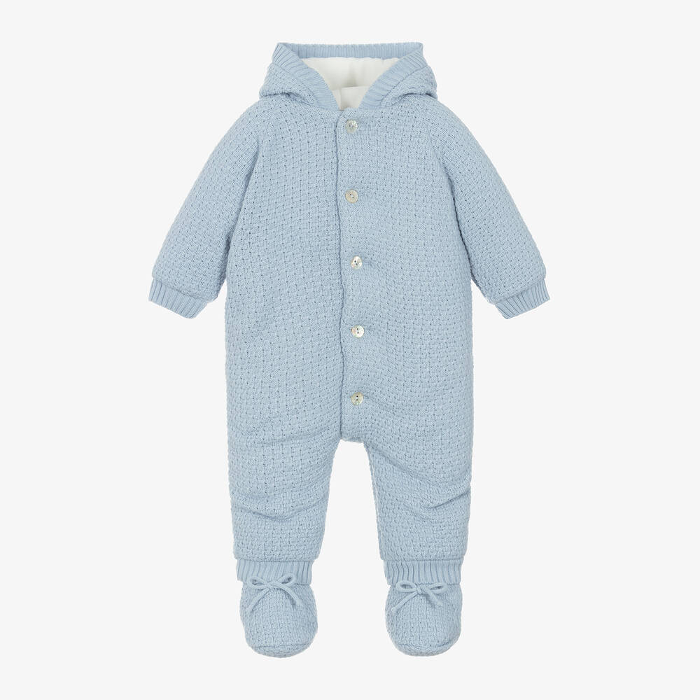 Blue knitted pramsuit for baby boys and girls by Spanish designer, Paz Rodriguez. Gently padded, this cute pramsuit has a basket weave pattern and ribbed trims. For an extra cosy feel, it is lined in soft velour, with a fixed hood and mother-of-pearl branded button fastenings. It comes with a pair of matching booties, ideal for keeping little feet warm.