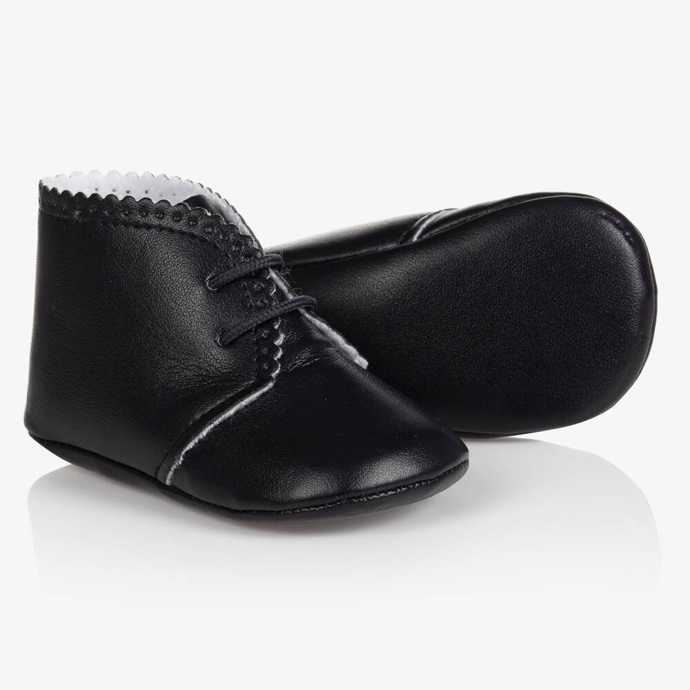Navy blue lace-up baby shoes by Paz Rodriguez. Made in faux leather, they have a soft, felted cotton lining and perforated detailing, with a smooth outer sole.