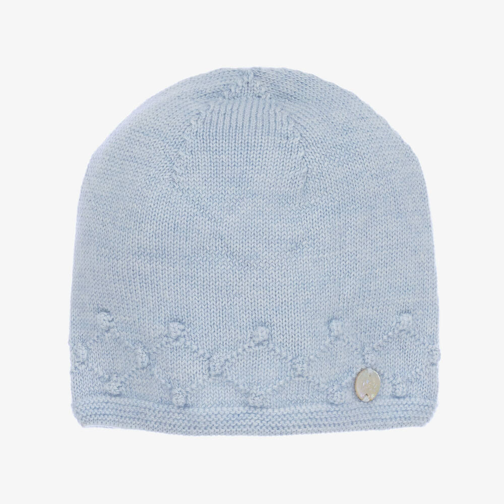 A lovely pale blue hat for baby boys and girls by Spanish brand Paz Rodriquez. Cosy and comfortable, it is finely knitted in luxuriously soft Merino wool. It is detailed with a charming diamond pattern, and has a mother-of-pearl logo charm to finish.