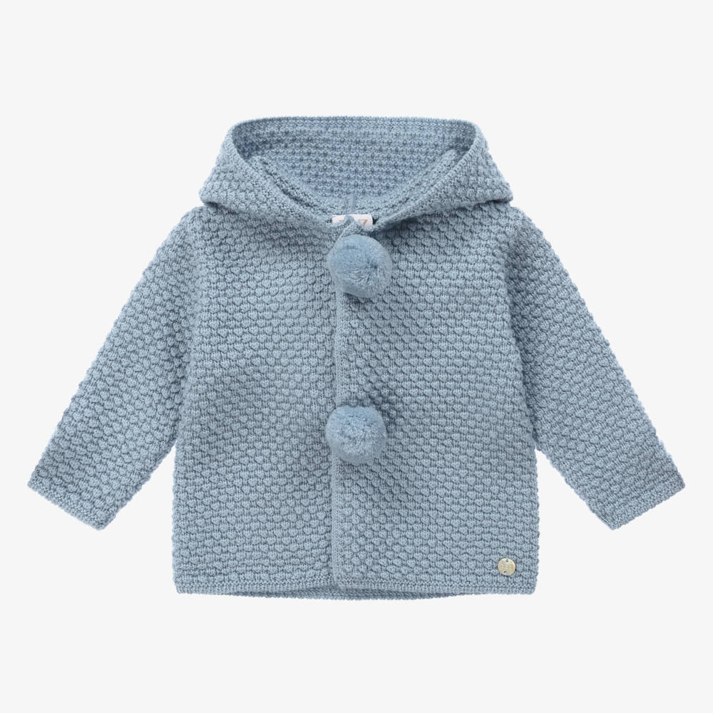 Blue hooded pram coat for little boys and girls by Paz Rodriguez, knitted in soft wool with a lovely textured pattern. Fastening with poppers, it has adorable pom-pom details on the front and hood. For a discreet designer finish, there is a branded mother-of-pearl logo charm above the front hem.
