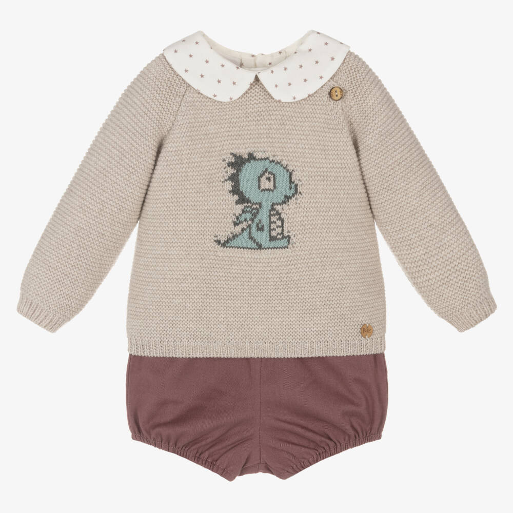 Cute three piece shorts set for baby boys by Paz Rodriguez. The ivory cotton muslin shirt has a purple star pattern and a rounded collar. It has elasticated cuffs and button fastenings on the back. The beige Merino wool jumper has a cute blue dragon motif on the front and wooden button fastenings on one shoulder. Purple cotton shorts complete the set.
