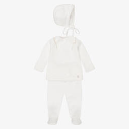 This traditional blue babysuit set by PAZ Rodríguez offers a charming and cosy outfit for baby boys. Knitted with a touch of cashmere for added softness, the two-piece babygrow features a subtle pattern, mother-of-pearl logo charm and button fastenings. The accompanying hat and blanket offer extra warmth when out and about. Lovely as a gift, the set comes beautifully presented in a branded box.