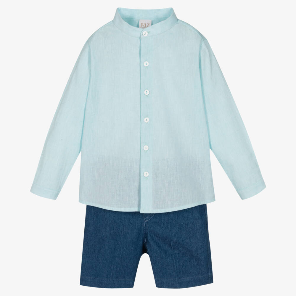 Blue shorts set for boys from Paz Rodriguez. The turquoise blue cotton and linen blend shirt is collarless, with branded button fastenings on the front and cuffs. It comes with dark blue denim shorts that have four handy pockets and a beige logo patch on the back. They have an adjustable waist and fasten easily with a zip and logo button.