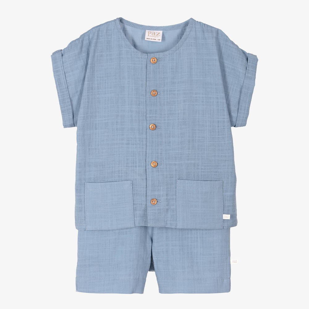 Pale blue cotton shorts set for little boys by classic brand Paz Rodríguez, ideal for warm, sunny days. With the look of linen, it has branded wooden button fastenings on the top, with useful front pockets on both pieces. The coordinating shorts are comfortably lined, with a gently elasticated waistband.