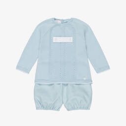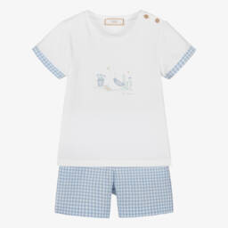Smart-casual, blue and white shorts set for boys by Spanish brand, Paz Rodriguez. The soft and lightweight cotton-blend seersucker shirt has a fresh gingham check. It fastens with branded buttons and the sleeves can be rolled up and secured with a tab for a more casual look. The white cotton shorts have a lovely slub weave and pockets on the front and back. Fastening with a zip and button, they have an adjustable waistband and belt loops for added style and comfort. Completing the look, there is a discreet logo tab on the back.