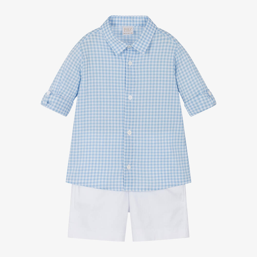 Smart-casual, blue and white shorts set for boys by Spanish brand, Paz Rodriguez. The soft and lightweight cotton-blend seersucker shirt has a fresh gingham check. It fastens with branded buttons and the sleeves can be rolled up and secured with a tab for a more casual look. The white cotton shorts have a lovely slub weave and pockets on the front and back. Fastening with a zip and button, they have an adjustable waistband and belt loops for added style and comfort. Completing the look, there is a discreet logo tab on the back.