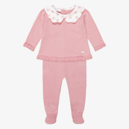 In a lovely shade of blue, this two piece babygrow for boys by Paz Rodriguez, is knitted with extra fine Merino wool for softness and comfort. The long-sleeved top has a white Peter Pan collar and a raised diamond stitch pattern. It fastens on the back with buttons and includes the brand's signature mother-of-pearl logo charm on the hem. Easy to pull on, the matching trousers have a comfortable elasticated waist and cosy, enclosed feet.