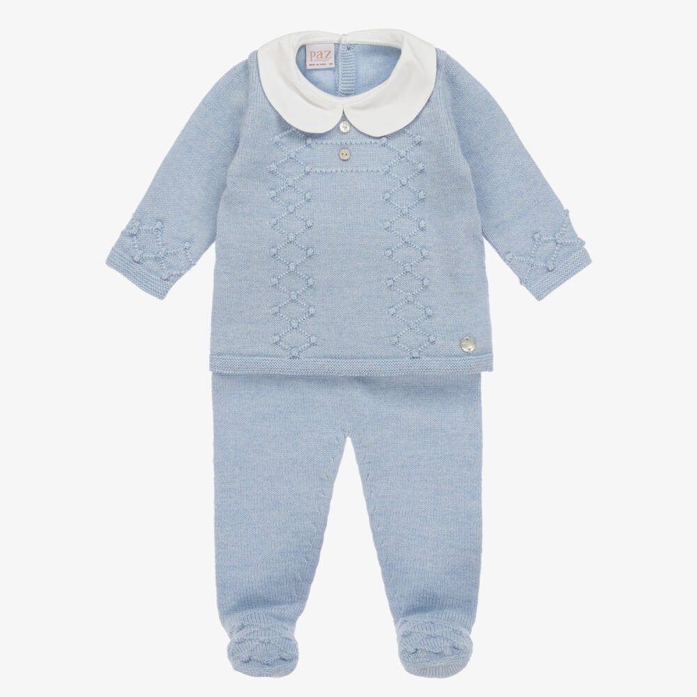 In a lovely shade of blue, this two piece babygrow for boys by Paz Rodriguez, is knitted with extra fine Merino wool for softness and comfort. The long-sleeved top has a white Peter Pan collar and a raised diamond stitch pattern. It fastens on the back with buttons and includes the brand's signature mother-of-pearl logo charm on the hem. Easy to pull on, the matching trousers have a comfortable elasticated waist and cosy, enclosed feet.