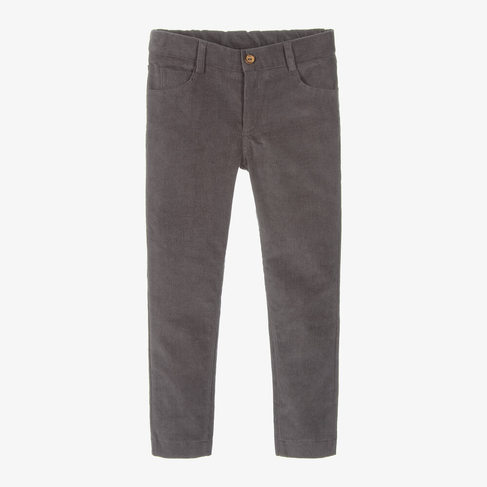 Dark grey trousers for boys by Spanish brand Paz Rodríguez, made in soft, fine needlecord. These casual, jeans-style trousers have five pockets and a small leather logo patch on the back. They have a useful adjustable waist for a comfortable fit and they fasten with a wooden button and a zip on the front.