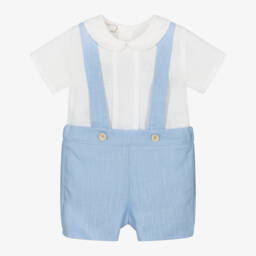 This charming green and white shorts set for little boys by PAZ Rodríguez is made in cool and comfortable linen. Traditionally styled, the short-sleeved shirt has a sweet Peter Pan collar and delicate front pleats. It fastens with buttons on the back. The mint green shorts are lined for comfort and have attached shoulder straps and an adjustable waist for a comfortable fit.