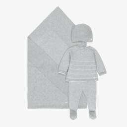 This traditional grey babysuit set by PAZ Rodríguez offers a charming and cosy outfit for baby boys. Knitted with a touch of cashmere for added softness, the two-piece babygrow features a subtle pattern, mother-of-pearl logo charm and button fastenings. The accompanying hat and blanket offer extra warmth when out and about. Lovely as a gift, the set comes beautifully presented in a branded box.