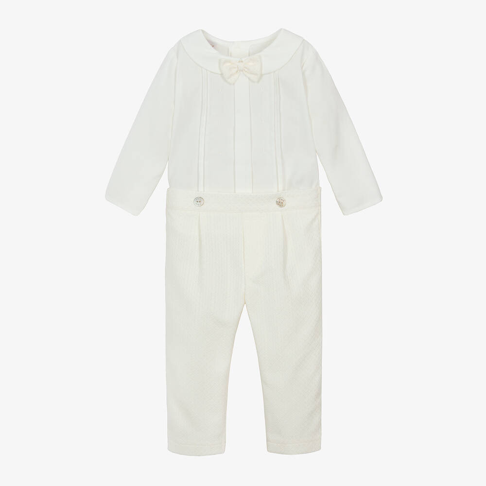 A smart ivory trouser set for younger boys by Spanish brand Paz Rodríguez, ideal for special occasions and celebrations in the warmer weather. Buttoned on the back, the long-sleeved cotton top is detailed with delicate tonal stitching and pintuck pleats. It is styled with a Peter Pan collar and a fixed bow tie in the centre. The paired trousers are adjustable on the waist and lightly textured with a basket weave finish for a contrast in textile design. Front darts and mother-of-pearl buttons add further detail, seen when the top is neatly tucked in.