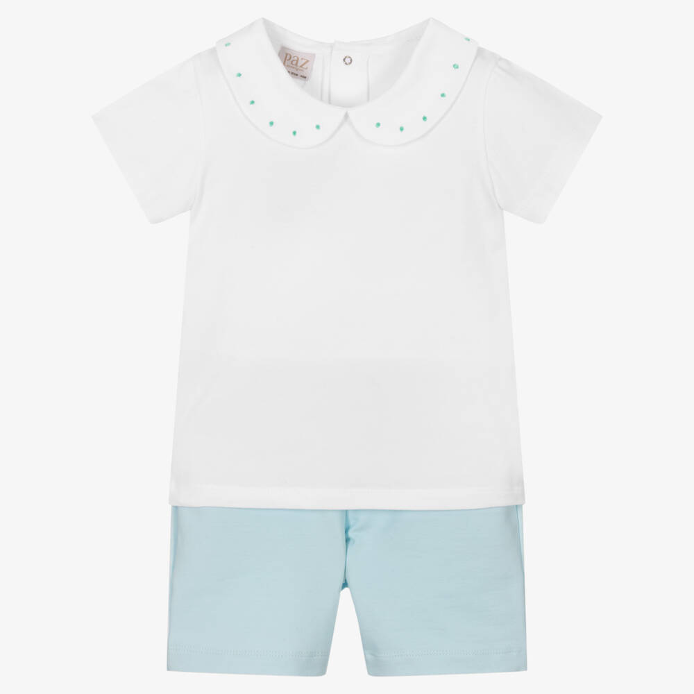 Little boys white and blue shorts set by Spanish brand Paz Rodriguez, made in beautifully soft cotton jersey. The white T-shirt has a traditionally-styled rounded collar with a green dotted embroidery, and useful poppers on the back. It comes with comfortable jersey shorts with a faux ivory woven drawstring for a cute, co-ordinated look.
