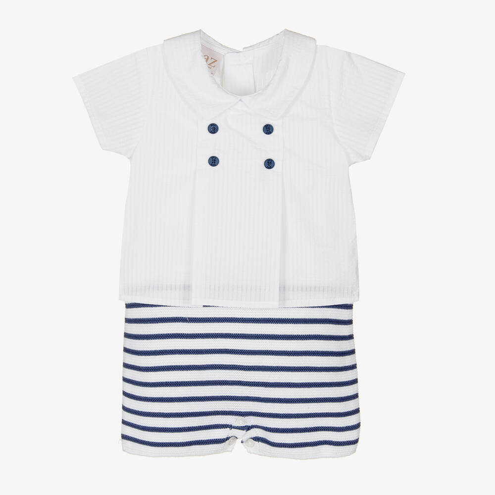 In white and navy blue, this classically styled shortie for baby boys is by Paz Rodriguez. Made in comfortable cotton, the upper part is made in stretchy jersey, whilst the lower part is softly knitted in a lovely striped pattern. The attached top has a pleated detail on the front, trimmed with navy blue buttons. This charming nautical-look babysuit fastens with buttons on the back and between the legs.