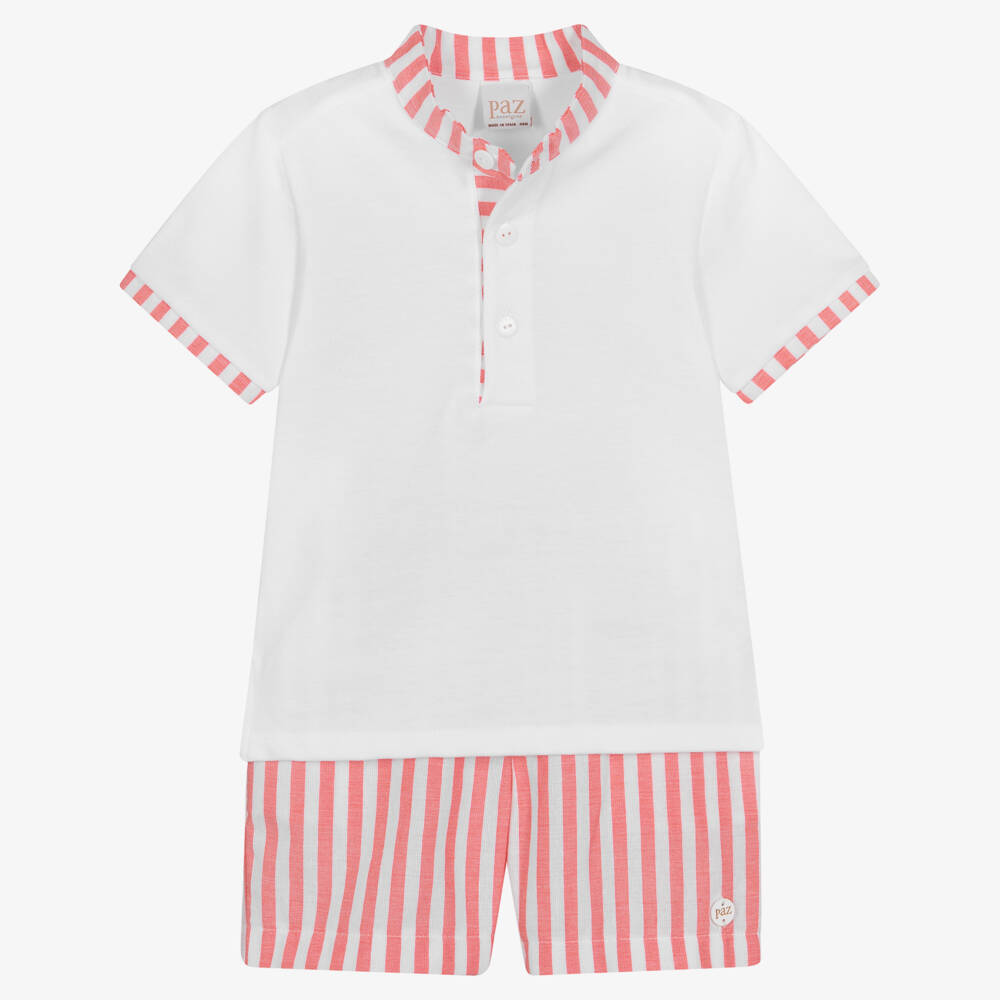 White and red striped cotton shorts set for boys by traditional Spanish brand Paz Rodriguez. The soft, white piqué T-shirt has striped, slightly ridged trims, logo button fastenings on the front and side vents to allow for extra movement. The coordinating, striped shorts have jetted side pockets, a faux drawstring and a logo charm on one leg.