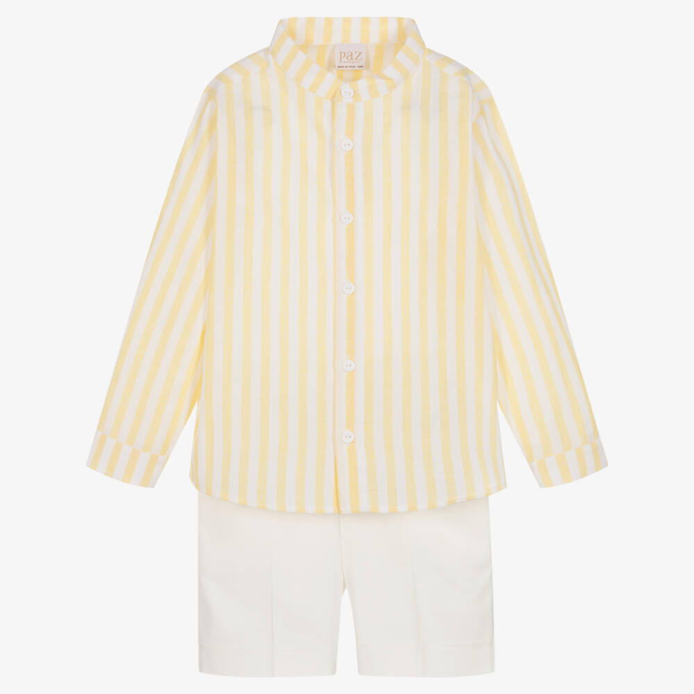 Smart-casual yellow shorts set for boys from Paz Rodriguez. Striped in yellow and ivory, the collarless shirt is made in a lightweight linen-blend weave, with classic button fastenings on the front. Crafted in soft, stretchy cotton twill, the ivory shorts have useful front pockets and an adjustable waist for a good fit.