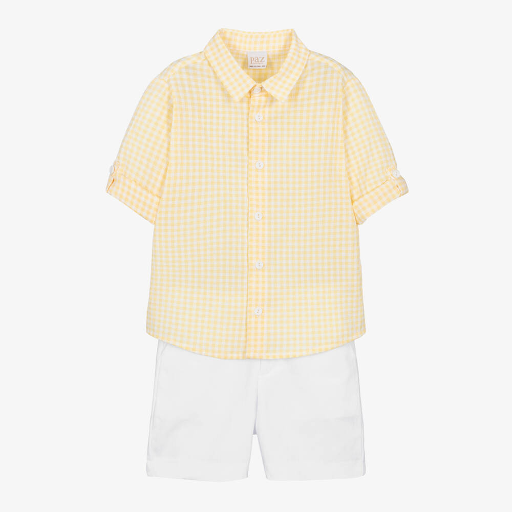 Smart-casual yellow and white cotton shorts set for boys from Spanish brand, Paz Rodriguez. A clean, fresh look, the lightweight seersucker shirt has a gingham pattern and branded white button fastenings. For a more casual feel, the sleeves can be turned up and secured with a button tab. The white shorts have a lovely slub weave and a slight stretch for comfort. Designed with slanted front pockets and a single welt pocket on the back, they fasten with a zip and branded button. Ensuring a good fit, the waistband is adjustable and finished with belt loops.