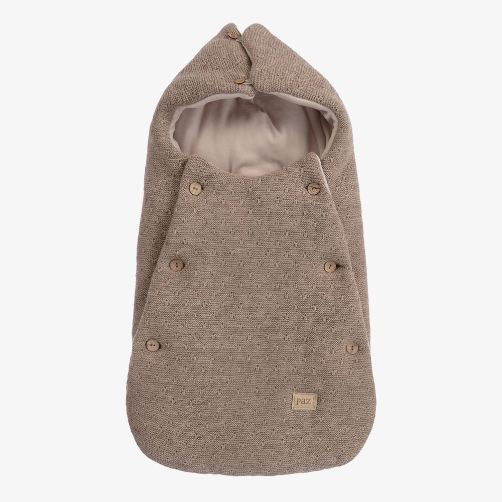 Lovely brown nest for baby boys and girls by Spanish brand Paz Rodriguez, knitted in a chunky wool blend. Lined with super soft velour to be comfortable against delicate skin, it has beautiful wooden button fastenings to allow the nest to be laid flat for your little one to lay or play on. A logo patch is sewn on the front for a subtle designer finish.
