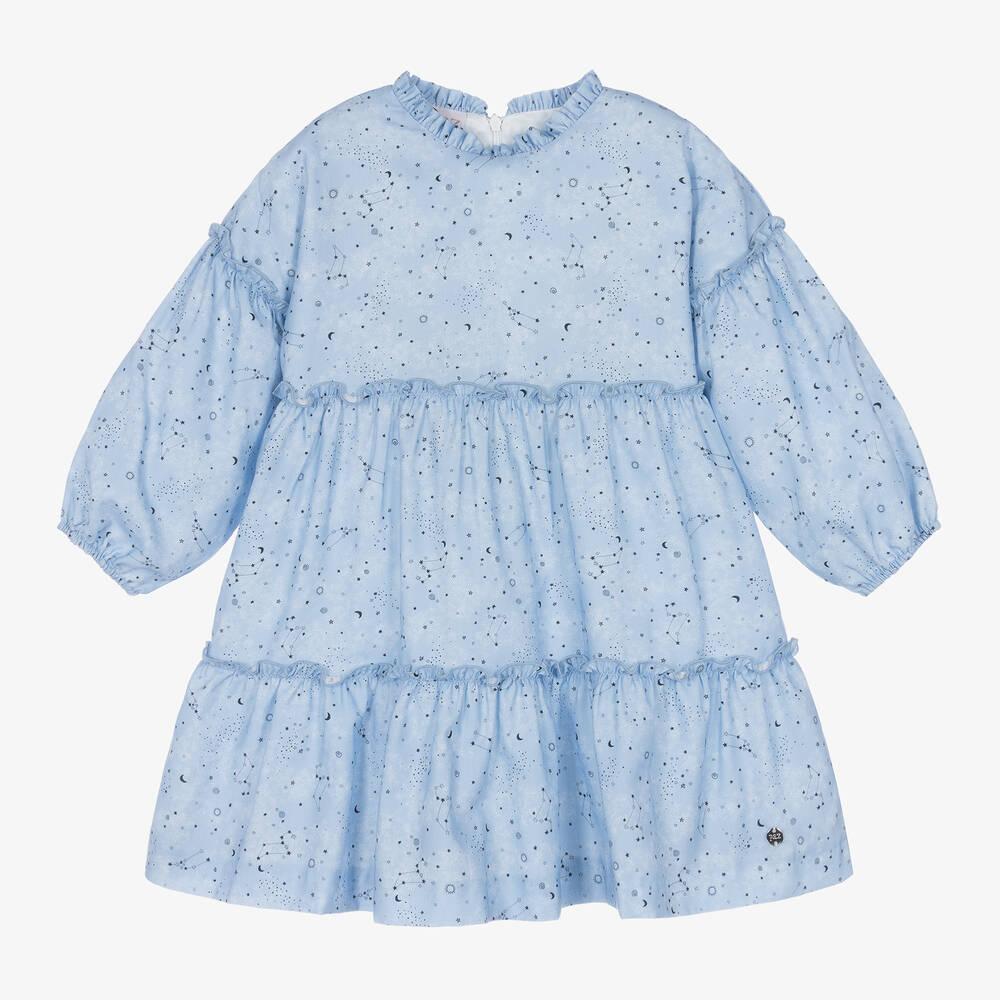 Pretty pale blue cotton dress for girls by Paz Rodríguez, with a lovely mottled effect and constellation patterns in black. This comfortable style is made in soft and lightweight twill with a lightweight voile lining. Tiered and gathered for a flared silhouette, it has pretty ruffle trims and puffed sleeves with elasticated cuffs. The dress fastens with a concealed zip on the back for a neat finish.