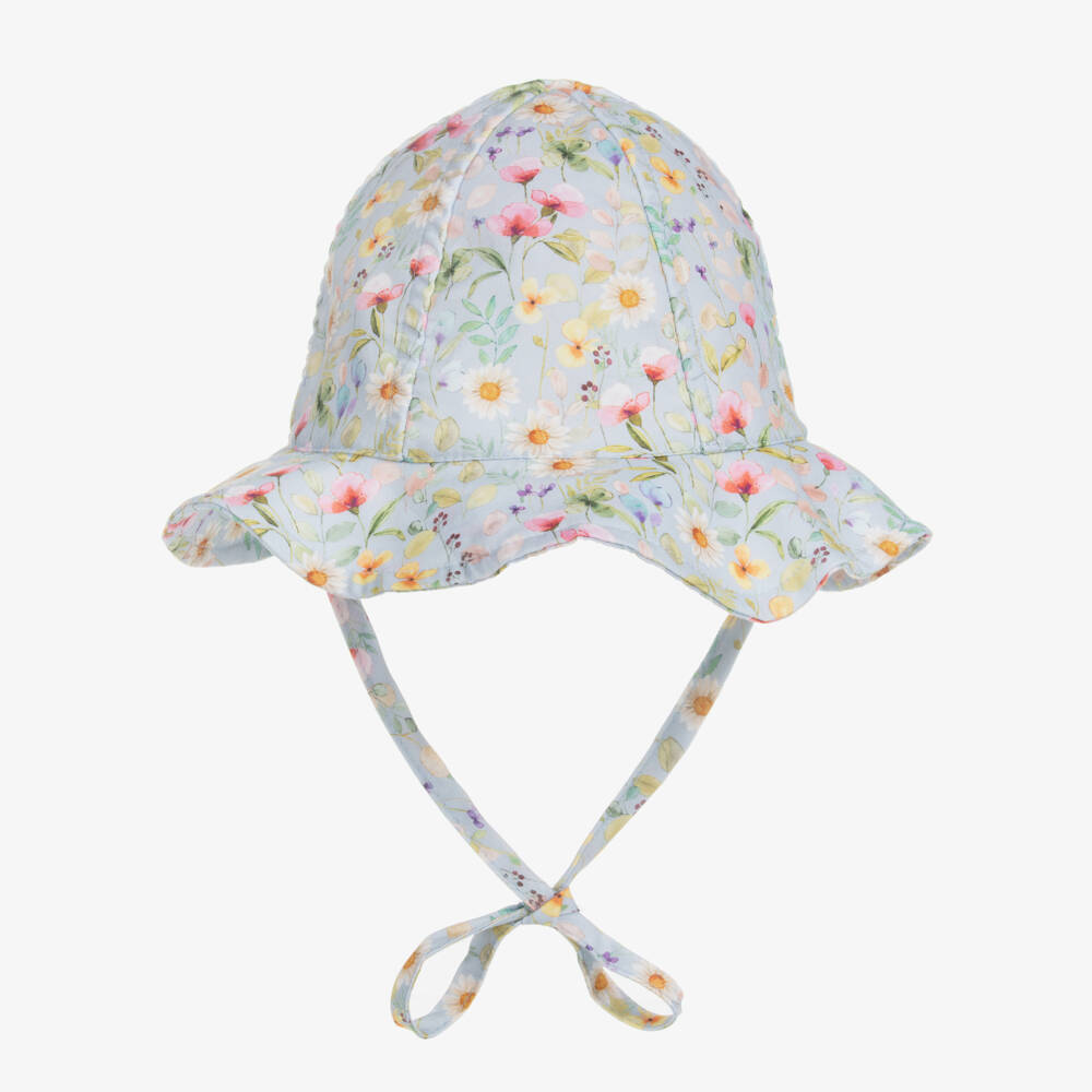 Summery pale blue floral hat for little girls by Paz Rodriguez, made in soft and lightweight woven cotton. The colourful floral print is complemented by a feminine bow on the back. There is a chin strap and an elasticated band on the back for a comfortable fit.