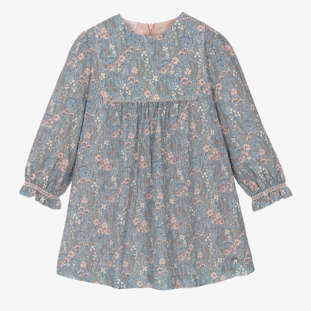 So pretty for little girls, a blue and pink floral patterned dress from Spanish brand Paz Rodriguez. Made in lightweight cotton plumeti and fully lined for comfort, this classic style has a charming bib front with pink embroidered trim. Sweet embroidered and elasticated ruffle cuffs and a metal logo charm on the front hem complete the look. For a neat finish, there is a concealed zip fastening on the back.