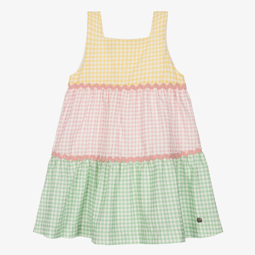 Sweet gingham dress for girls by Paz Rodriguez, with yellow, pink and green panels. Made and lined in soft cotton, this lovely tiered dress has a square neckline and pretty pink ric rac details. A hidden zip fastens on the back for quick and easy dressing.