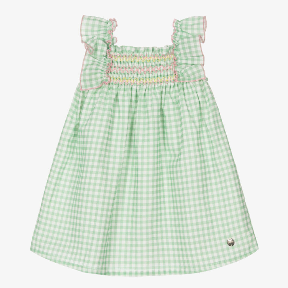 Summery green gingham dress for girls by Paz Rodriguez, made in lightweight cotton. It has ruffle trims on the shoulders and cute shirred panels with intricate pink and yellow embroidery. Slipping on over the head, it is lined with lightweight voile for a soft touch on the skin.