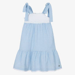 Younger girls green paisley dress by Paz Rodriguez, made from soft, comfortable cotton. Ideal for warmer days, this sleeveless dress has a cool cotton lining for added comfort. There is a sweet white bow on the front, matching lace trims and a small branded charm on the hem, for a discreet designer touch. For ease when dressing this pretty dress fastens with a concealed zip on the back.