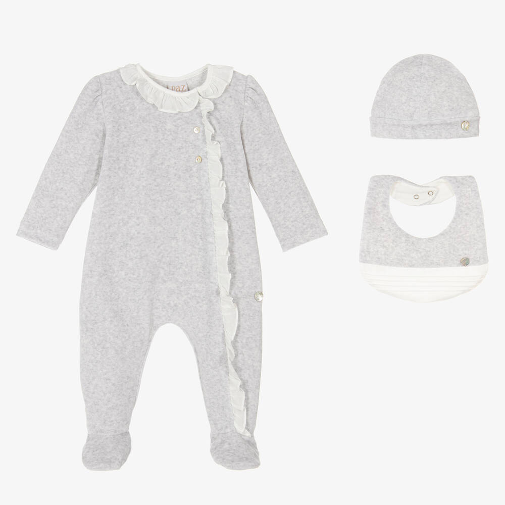 Cute grey babygrow, bib and hat set for girls by Paz Rodriguez, made in soft velour. The babygrow has gently puffed sleeves and a sweet white ruffle trim down the front and around the neck. It fastens with a zip on the front and poppers at the neck. The bib is lined in soft jersey, with a white pintucked panel on the front and poppers on the back. The set is completed by a double layer hat with a cute turned-up brim. All three pieces have mother-of-pearl logo charms on the front.