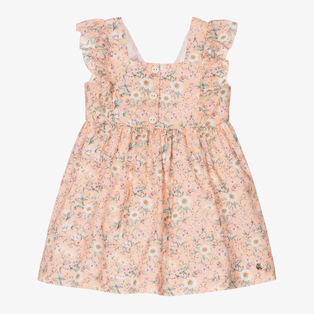 Girls pale orange cotton dress by Paz Rodriguez, with a colourful all-over daisy print. Summery in style, there are shoulder ruffle trims and decorative buttons on the front. Lined with voile, this dress fastens on the back with a concealed zip for a neat finish.