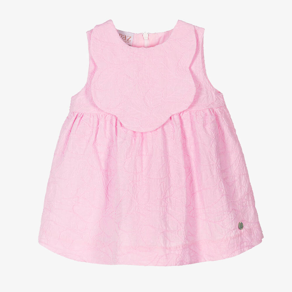 A delightful pink dress for girls by Paz Rodríguez, with a delicately embroidered leaf pattern. This sleeveless design is woven in soft cotton and has a pretty scalloped bib front. It is lined in lightweight cotton and fastens with a concealed zip on the back. A branded mother-of-pearl charm adds a subtle designer finish.