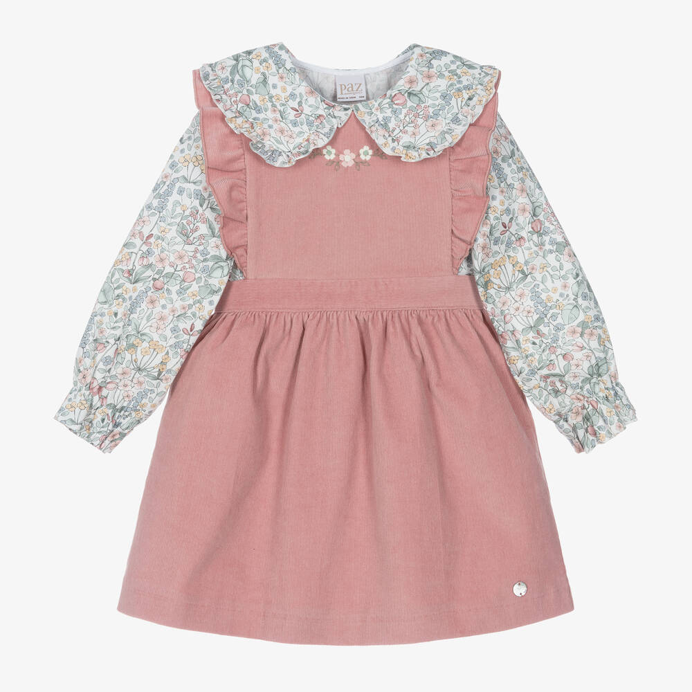 A lovely pink dress set for younger girls by Spanish brand Paz Rodríguez. Soft to the touch, the needlecord dress is embroidered with pretty pink and white flowers on the front. Zipping up on the back, this sleeveless style has ruffled trims and a mother-of-pearl logo charm on the hem. Designed to be worn underneath, the long-sleeved blouse is patterned with beautiful florals in pastel shades of pink, green and yellow. It has a frill-trimmed collar and wooden button fastenings. The cuffs are gently elasticated for a snug fit.