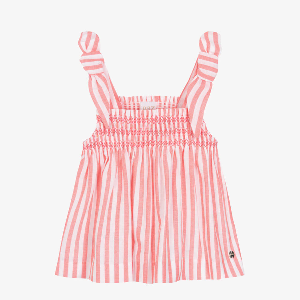 Delightful pink and white striped top for girls from Paz Rodriguez, made in lightweight woven cotton. Ideal for summer wear, this vest style top has fixed bows on the shoulders and a stretchy ruched chest panel.