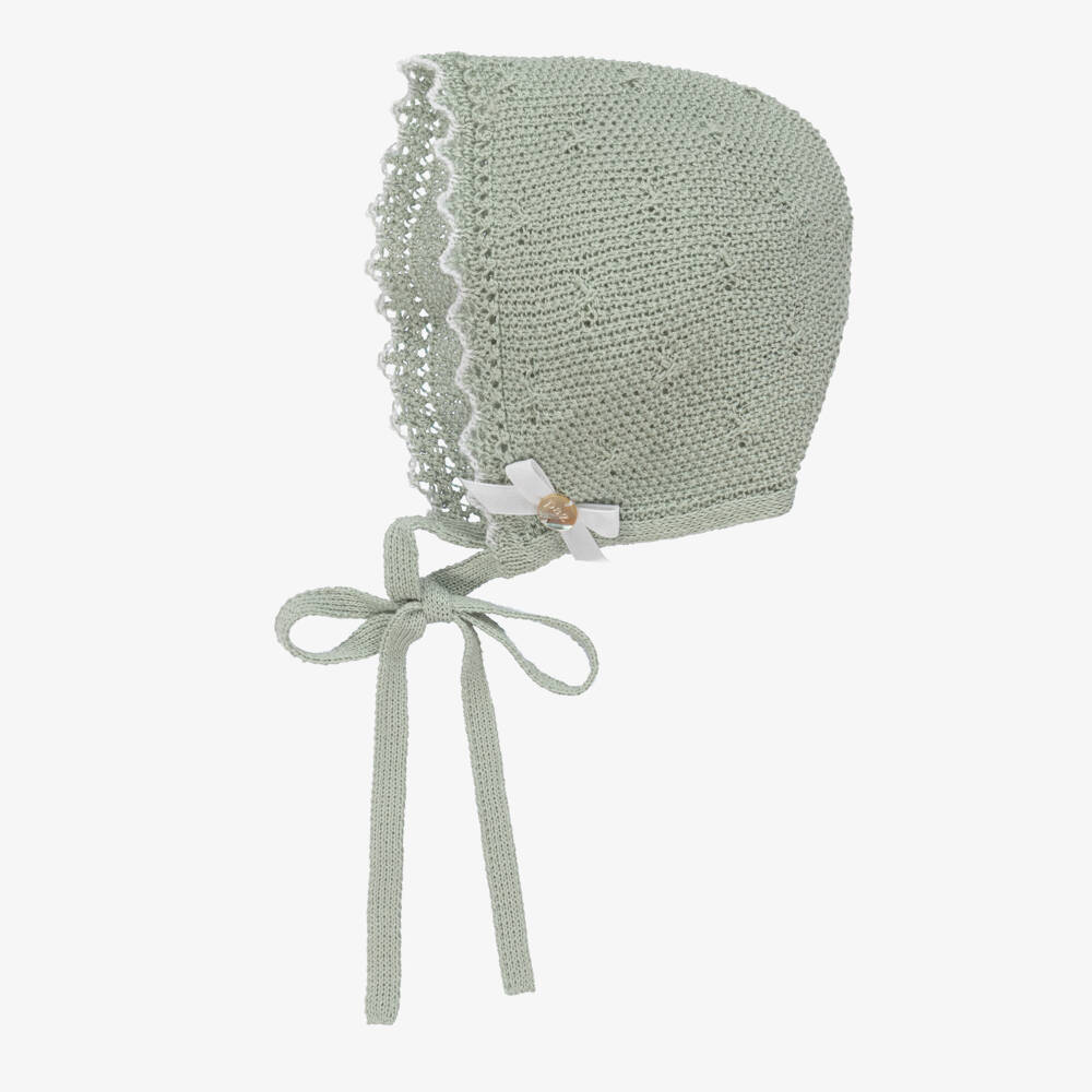 Sage green bonnet for baby boys and girls by traditional Spanish brand Paz Rodriguez. Knitted in soft cotton, it has a contrast, scalloped trim around the brim and a mother-of-pearl logo charm on one side with a white bow. It fastens underneath the chin with knitted ties for a secure fit.