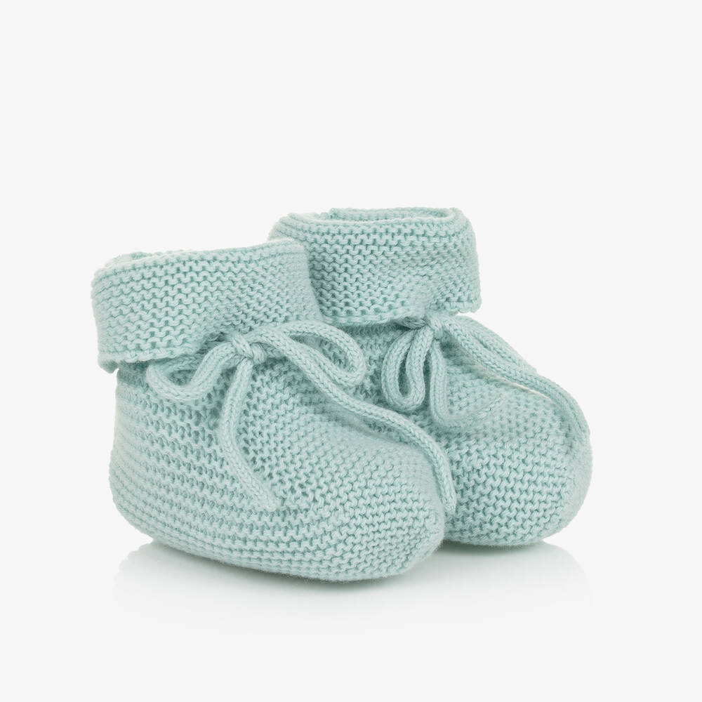Green booties for baby boys and girls by classic Spanish designer Paz Rodriguez. Knitted in beautifully soft cotton, they have fold-over cuffs and a tie fastening on the front for a secure fit and sweet finish.