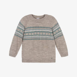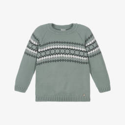A traditional green sweater for boys by PAZ Rodríguez, with a classic, geometric Fair Isle design in shades of blue and white. Knitted in a soft wool blend, it has raglan sleeves and cosy ribbed trims. A small silver logo charm on the hem adds a subtle branded finish.