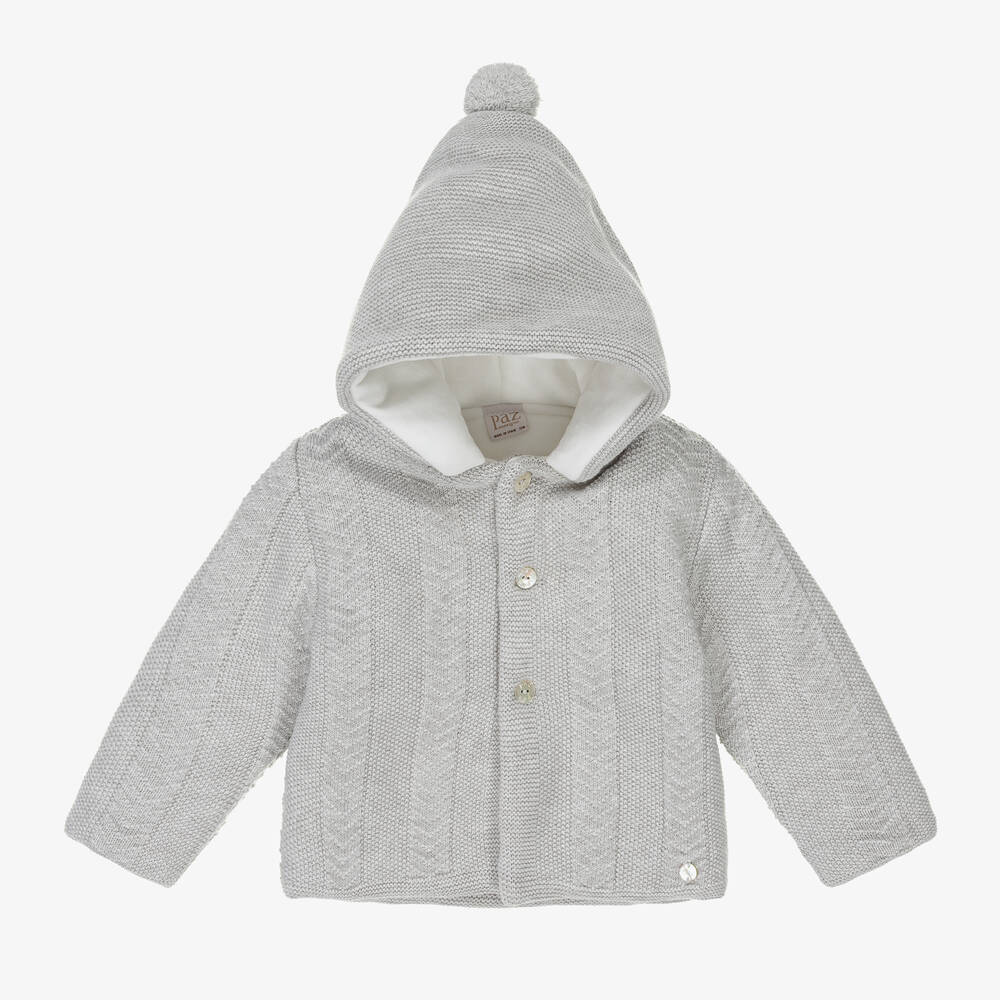 Lovely grey pram coat for baby boys and girls by Spanish designer Paz Rodriguez. Beautifully knitted, this hooded style is lightly padded and fully lined with super soft cotton blend velour for cosy comfort. Adding a touch of luxury feel, the front fastens with gorgeous mother-of-pearl buttons and has a matching logo charm by the hem.