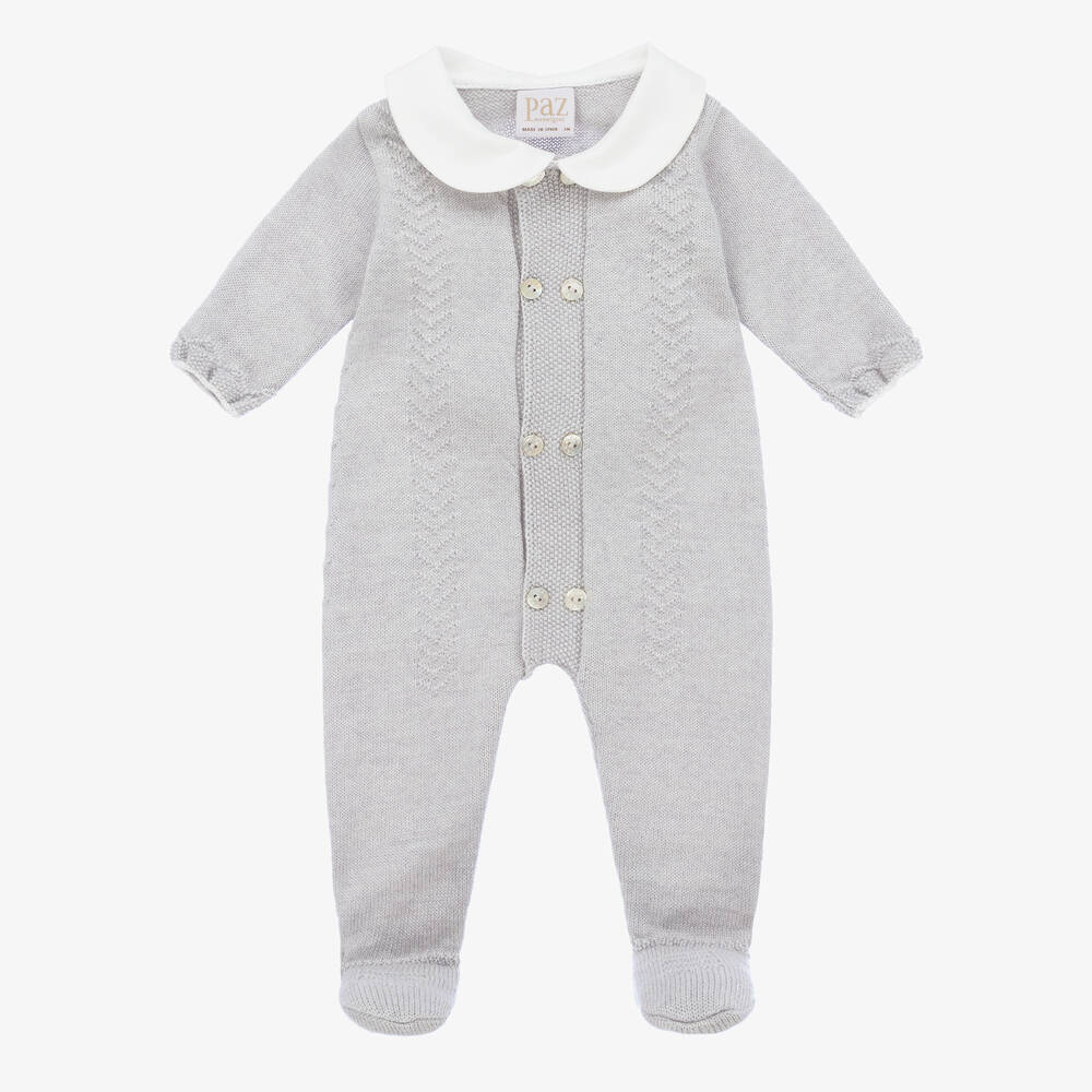 Lovely grey babygrow for boys and girls by Paz Rodríguez, knitted in super soft, extra-fine Merino wool. Gentle against delicate skin, it has a sweet, white rounded collar and a chevron pattern detailing. There are white trims on the cuffs and mother-of-pearl button fastenings on the front.