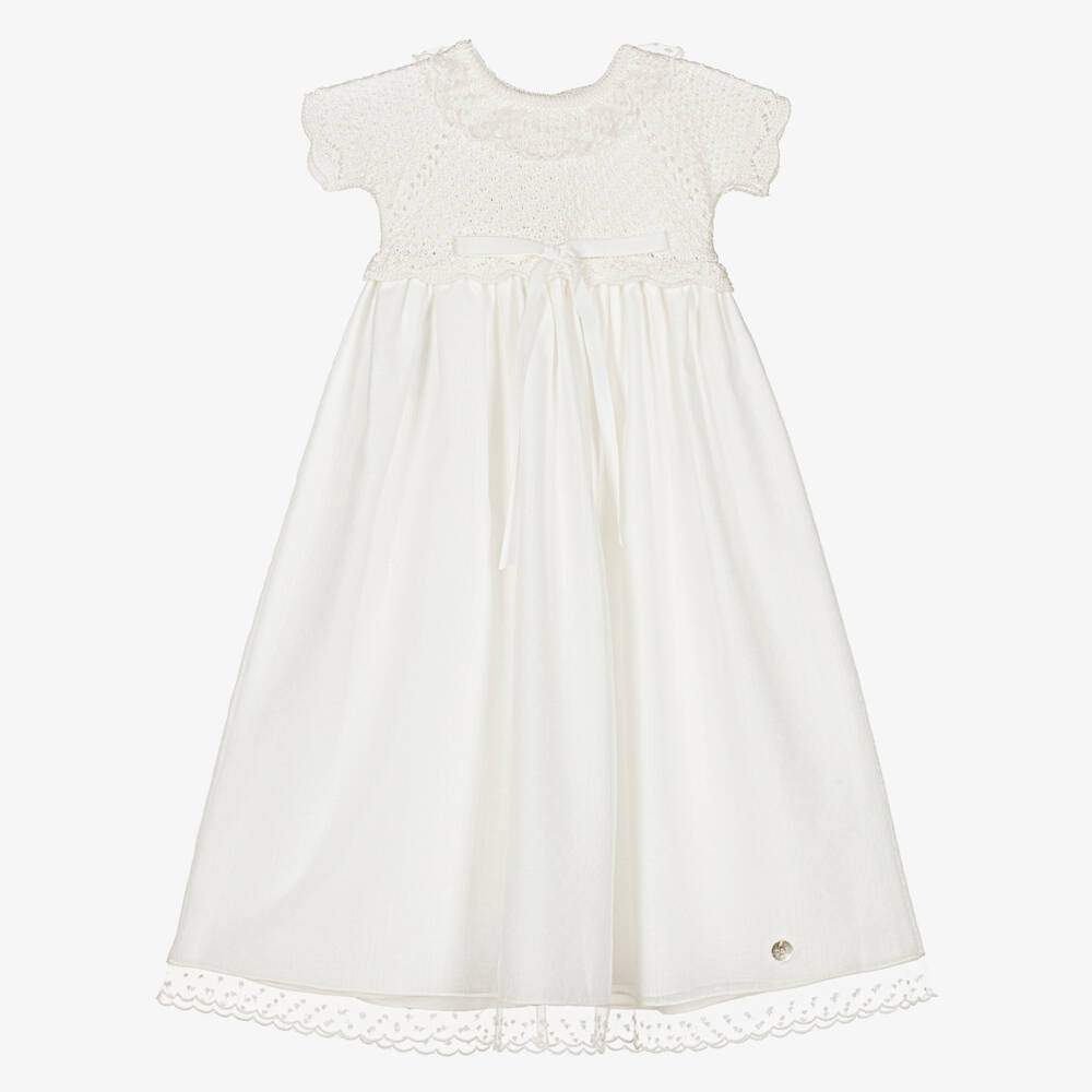From Spanish brand Paz Rodriguez, a traditional ivory ceremony gown for baby boys and girls. The bodice is beautifully knitted in a soft cotton blend, with a delicate scalloped lace collar, and sweet ribbon bow on the front. The lower half is made in fine and sheer fabric, with matching scalloped lace trim along the hem. This elegant gown is fully lined in soft cotton for comfort and fastens with mother-of-pearl buttons on the back.