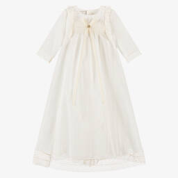 Traditionally styled ivory ceremony gown for baby boys and girls by Paz Rodríguez, made in soft and lightweight plumeti cotton. Fully lined for comfort, it has neat pintucks, lace trims and a ribbon bow on the front. It has a lovely scalloped hem with pretty cutwork floral detailing and a mother-of-pearl logo charm on the bodice. It fastens on the back with matching, branded buttons.