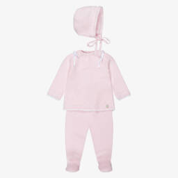 Lovely and timeless, this ivory babysuit set for boys and girls by PAZ Rodríguez is beautifully knitted in soft cotton. This cosy set includes a long-sleeved top with a dainty bow on each shoulder and button fastenings on the back. It pairs with matching enclosed-feet trousers and a sweet bonnet. Adding a subtle signature touch, each piece has a branded, mother-of-pearl disc.