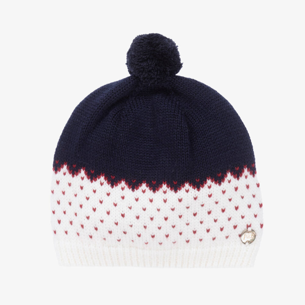 Navy blue and ivory pom-pom hat for little boys by Paz Rodriguez, knitted from super soft wool. The ivory bottom half has a red knitted pattern and a gold logo charm, adding a touch of shimmer to this cute hat.