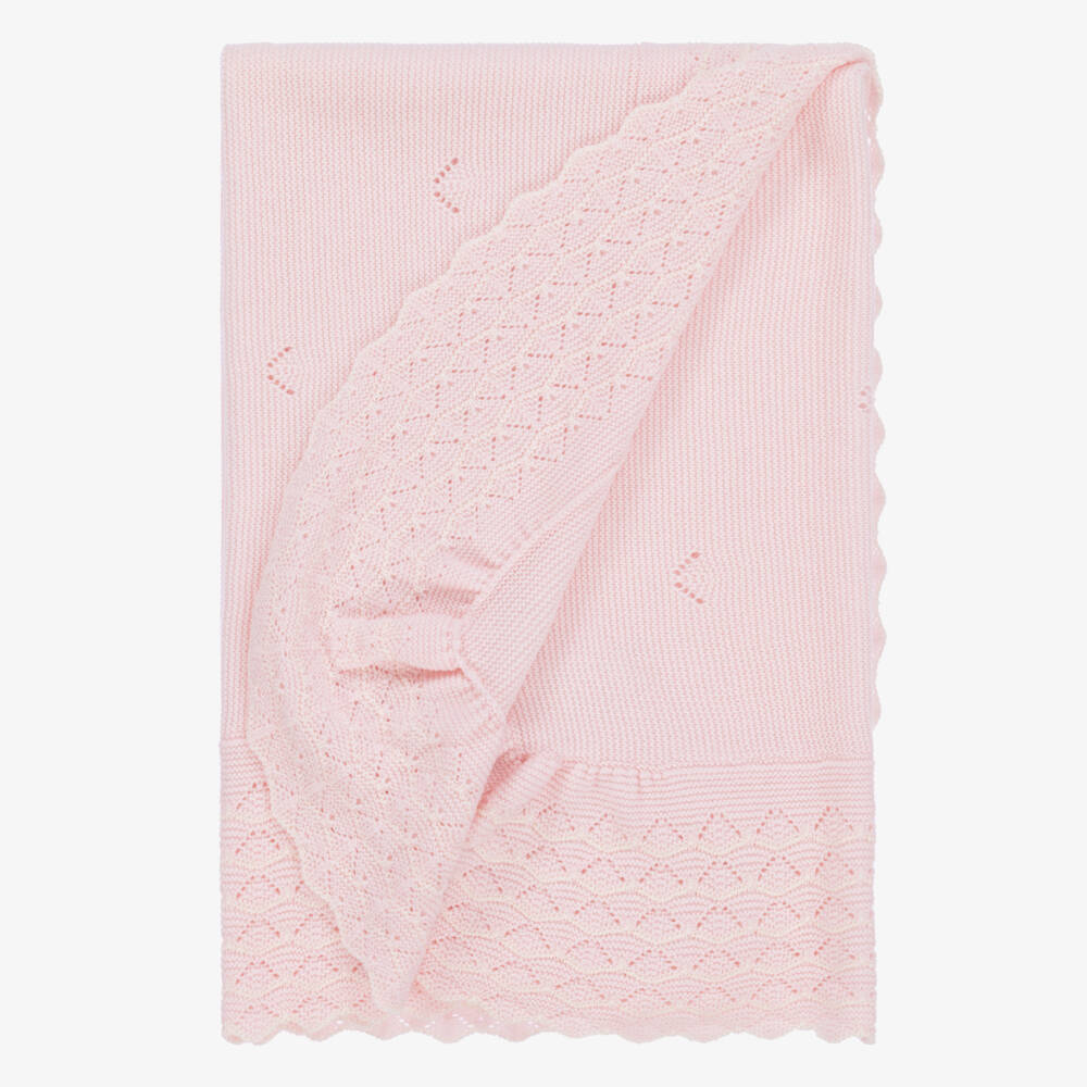 A charming pale pink shawl for baby girls by Paz Rodriguez, knitted in soft and lightweight Merino wool. Lovely for presenting baby, this delicate blanket is decorated in gorgeous openwork patterns, with a velvet bow and mother-of-pearl logo charm. An attractive nursery accessory, it will also drape beautifully over the pram or cot.