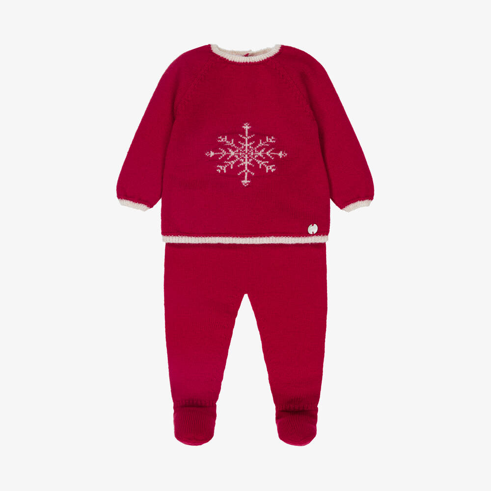 Beautifully knitted in extra fine Merino wool, this red two-piece babygrow for boys and girls is by Paz Rodriguez. Classic and charming for the festive season, the long-sleeve top has an ivory snowflake design and a mother-of-pearl logo charm on the front. It fastens neatly with buttons on the back. The cosy trousers have a gently elasticated waist and simply pull on.