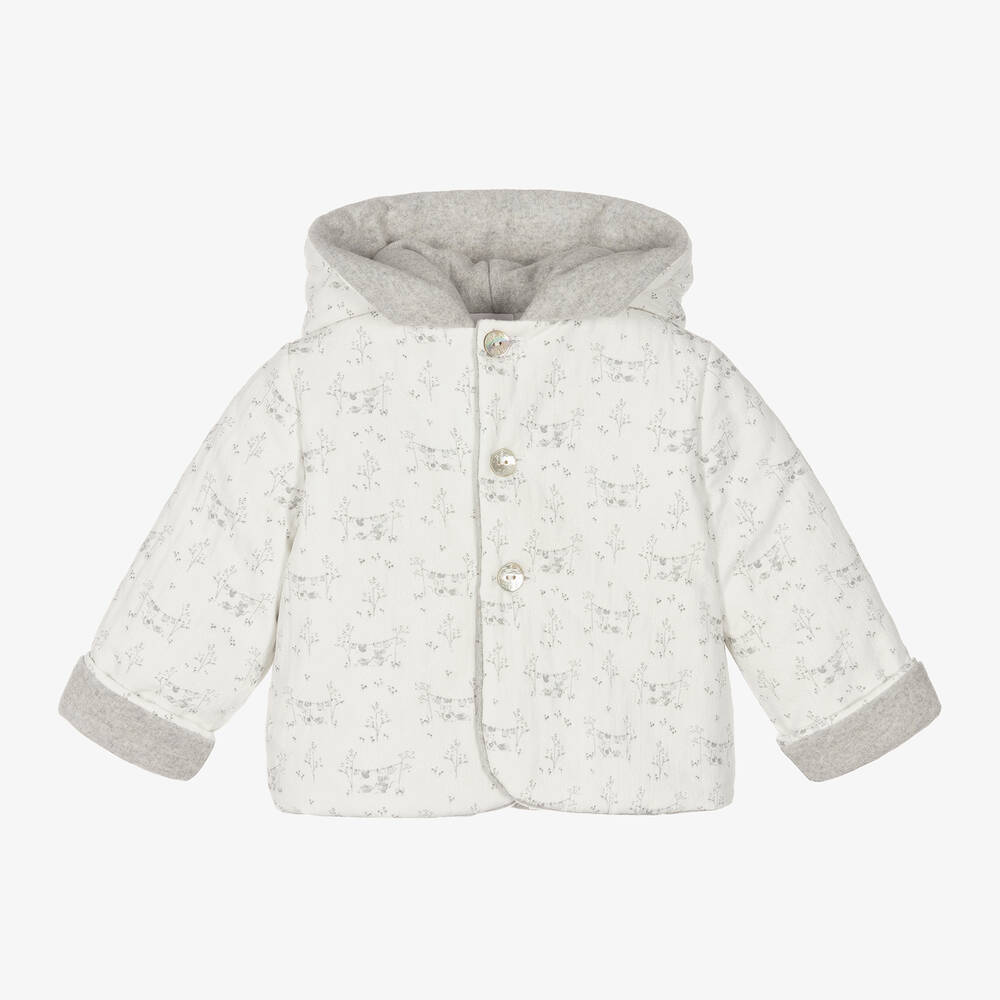 A white jacket for baby boys and girls from Paz Rodríguez, made in soft quilted cotton. It is patterned with an adorable motif of trees, little mice and laundry lines, all in grey. Lightly padded, this hooded jacket has a super-cosy, brushed lining made in a cotton blend. Branded mother-of-pearl buttons fasten on the front to complete the look.