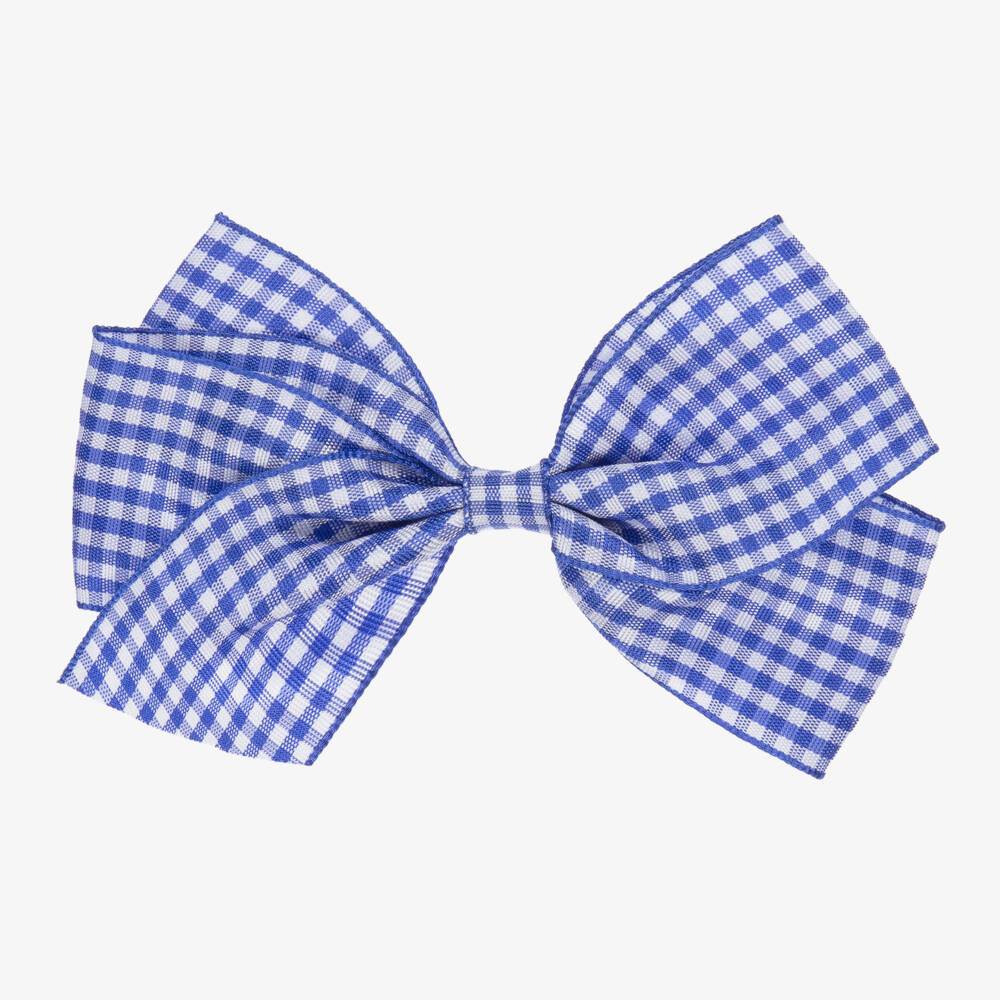 Large bow hair clip for girls handmade by Peach Ribbons, in royal blue and white gingham fabric.