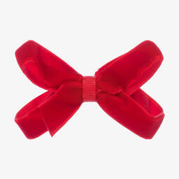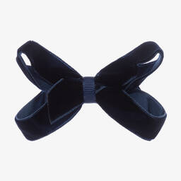 A pretty navy blue velvet bow hair clip for girls by Peach Ribbons, handmade and set on a slide-in metal clip.