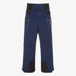 Navy blue Mini-me Chamonix ski trousers for boys and girls by Perfect Moment, with a removable zip-on high-rise waistband. Lightweight and water-resistant, they feature high-performance insulation, a four-way stretch fabric for easy movement, and advanced rescue technology for safety on the slopes. There are adjustable velcro straps on the waist, useful zipped pockets, reinforced zip-up cuffs, and ankle gaiters to keep the snow out.